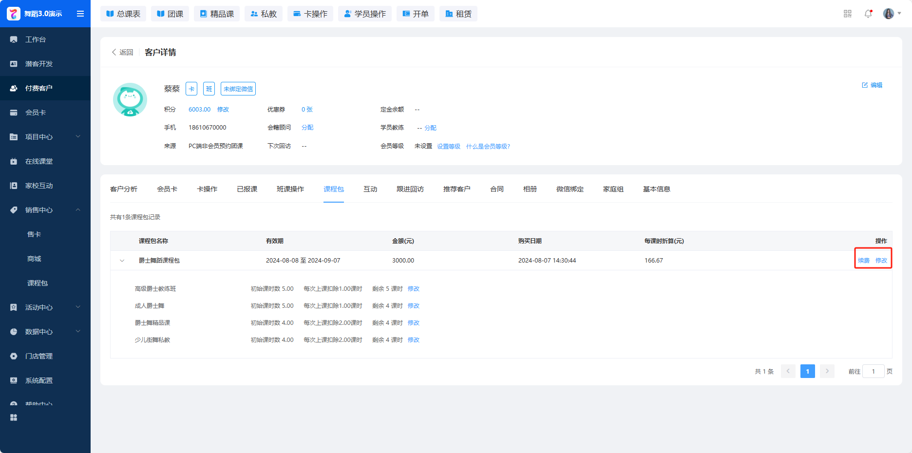 2. 在客户详情的课程表页面,可以选择课程包进行续费/修改