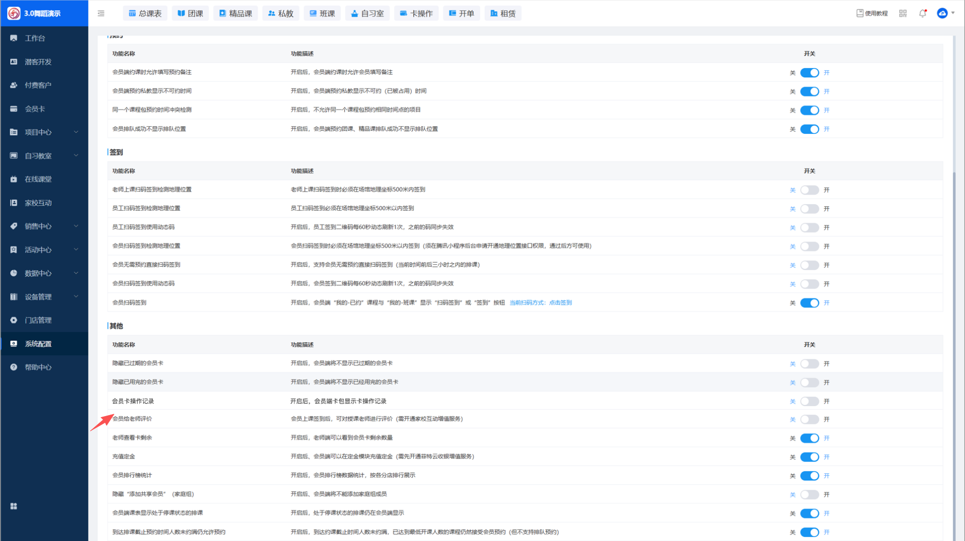 1.PC端增加“开关”会员卡操作记录 说明:开启后,会员端卡包显示卡操作记录
