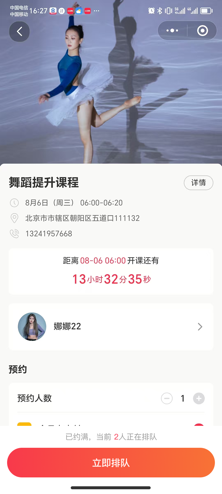 团课、精品课课程详细页,已约满正在排队时显示(大于等于1人时才显示):已约满,当前N人正在排队