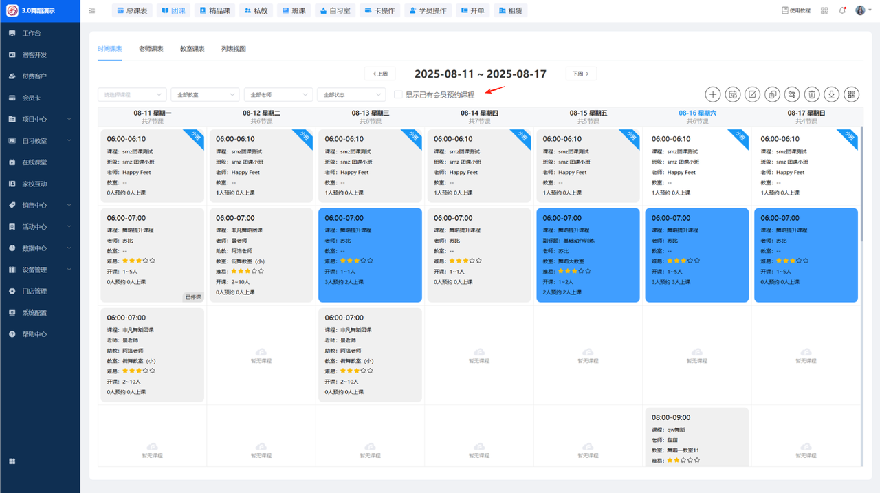 在团课、精品课课表中新增'显示已有会员预约的课'筛选功能,勾选后页面将自动刷新,仅展示已有会员预约的课。