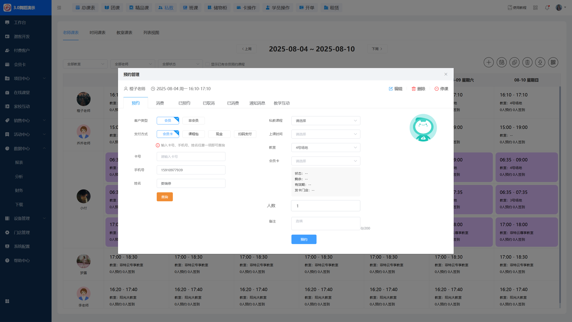 1. 私教代预约,在会员卡下方增加“人数”输入框,扣除数量时按人数扣除;填写人数时验证会员卡支持最大可约人数。