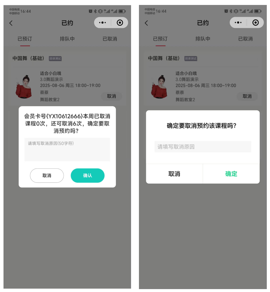 会员取消预约时,若该会员卡设置了取消规则,需要显示出可取消的次数,未设置取消规则,则不用显示。