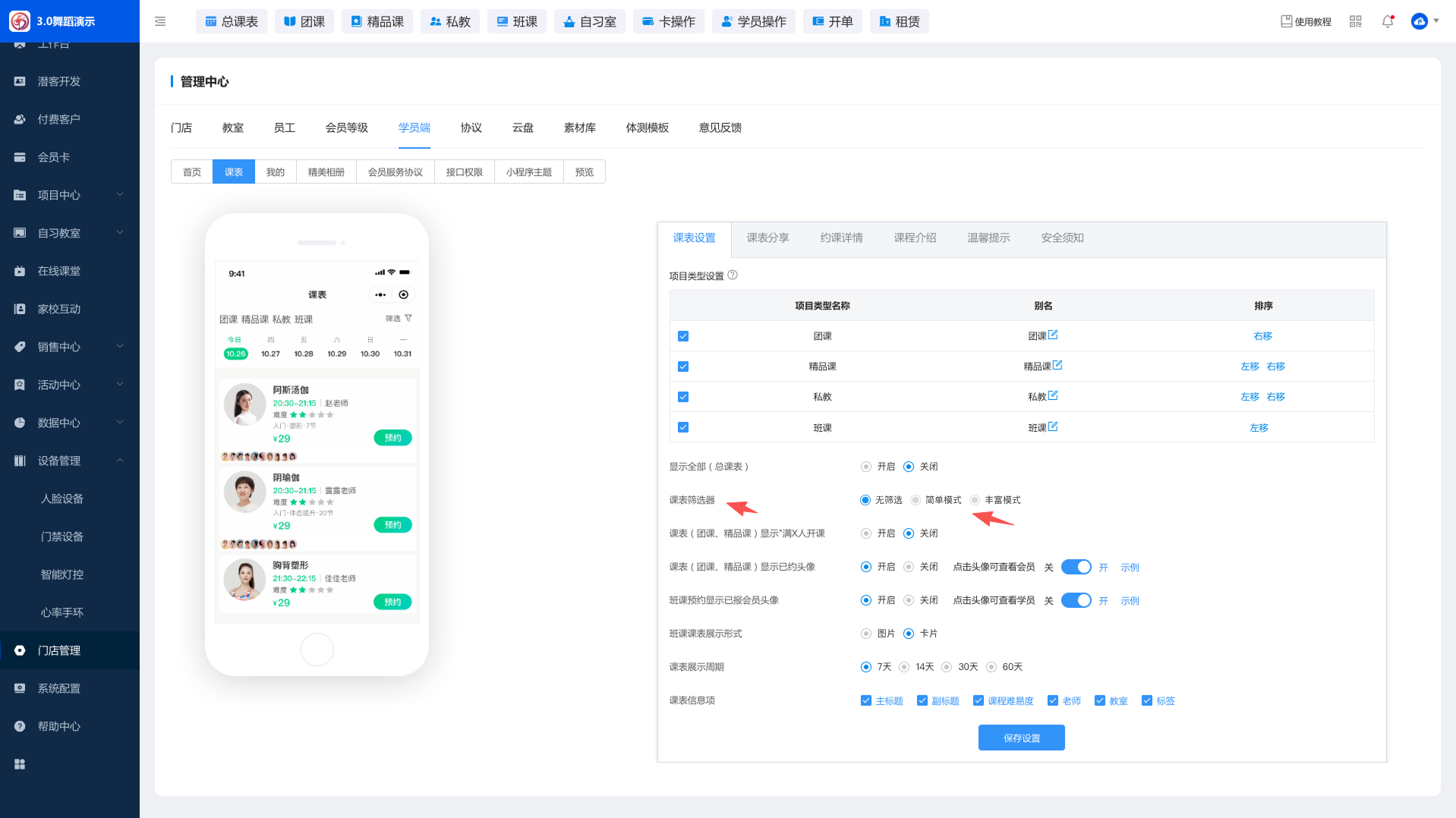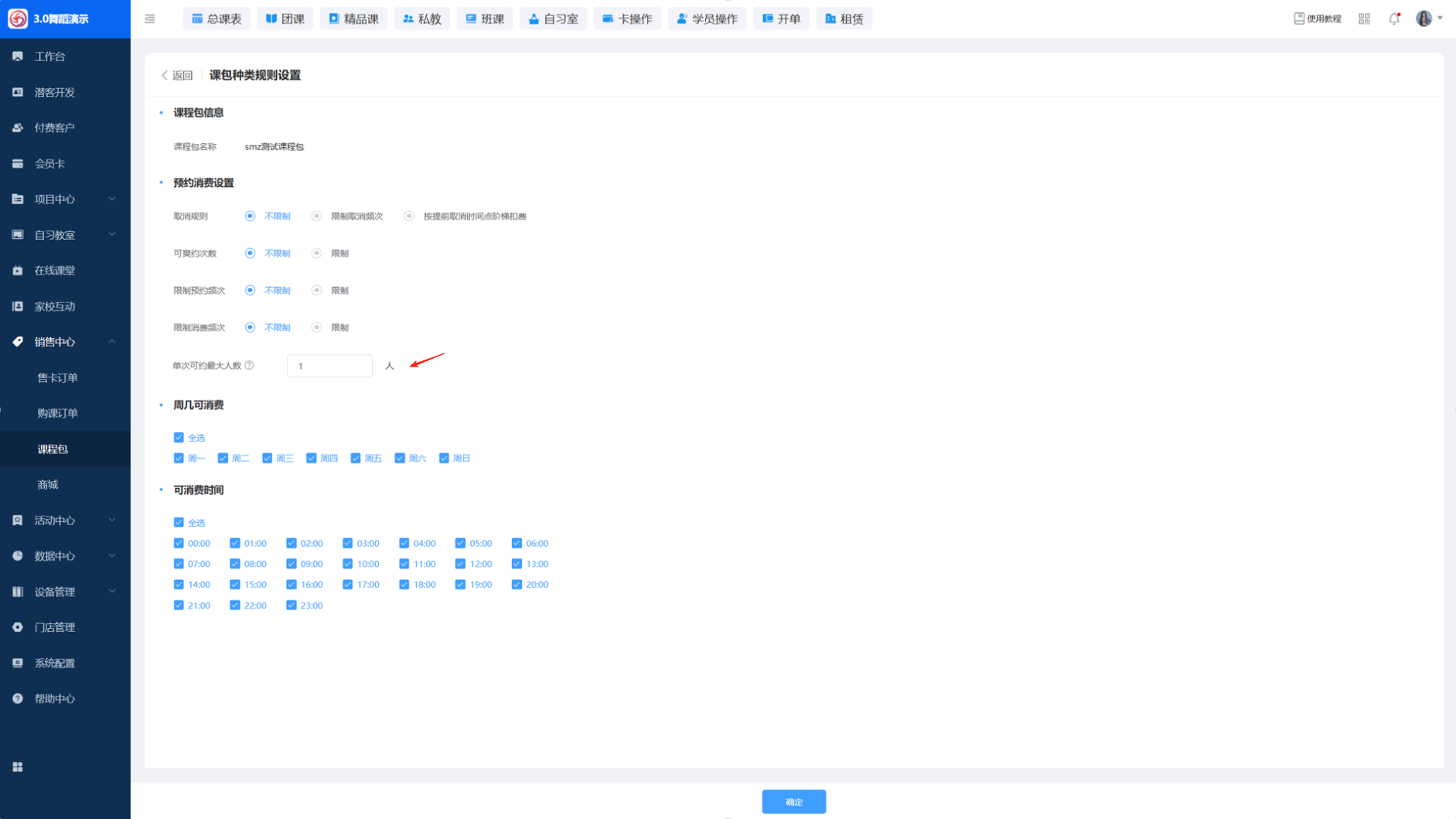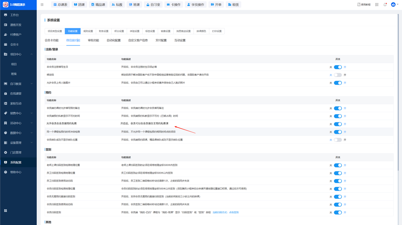 功能描述:开启后,会员可以在会员端自主预约私教课