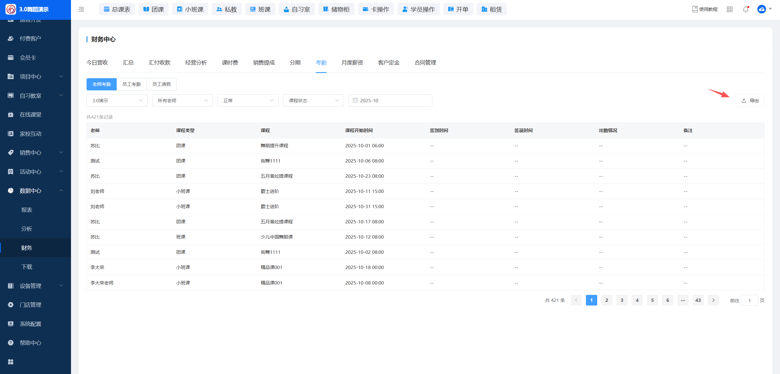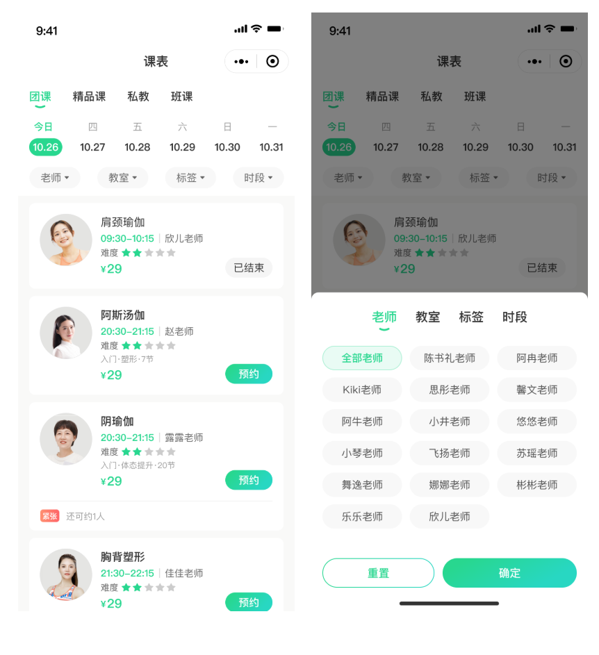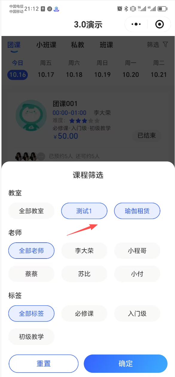 会员端,会员通过筛选查询课程,选择“课程标签”、教室、老师支持多选。