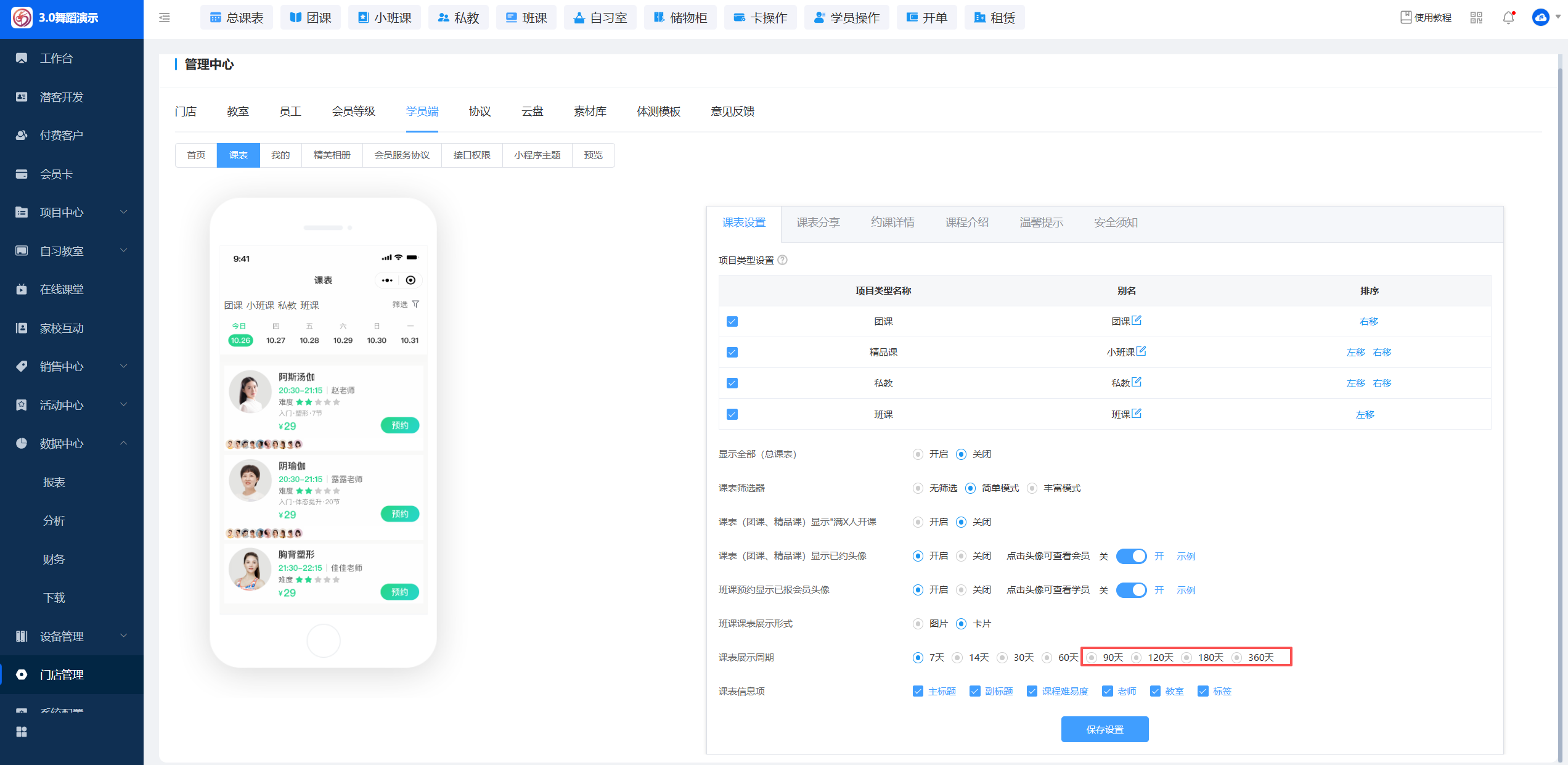 学员端,课表设置-课表展示周期增加:90天、120天、180天、360天选项,配置完成后,小程序端按照配置的天数显示。