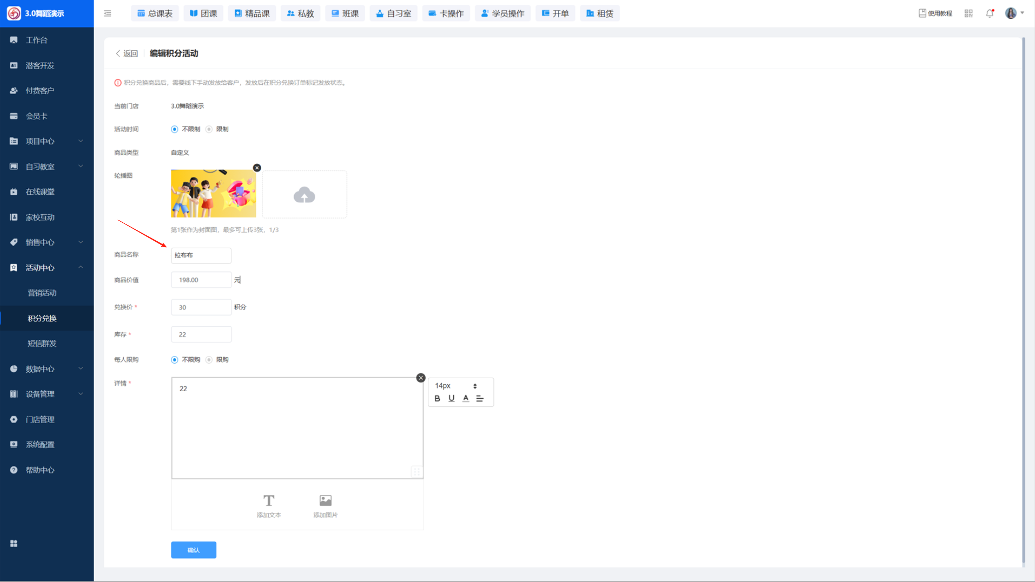 如下图,积分兑换商品(自定义商品)支持修改名称,修改后新名称即时生效(历史订单仍按原名称显示)。