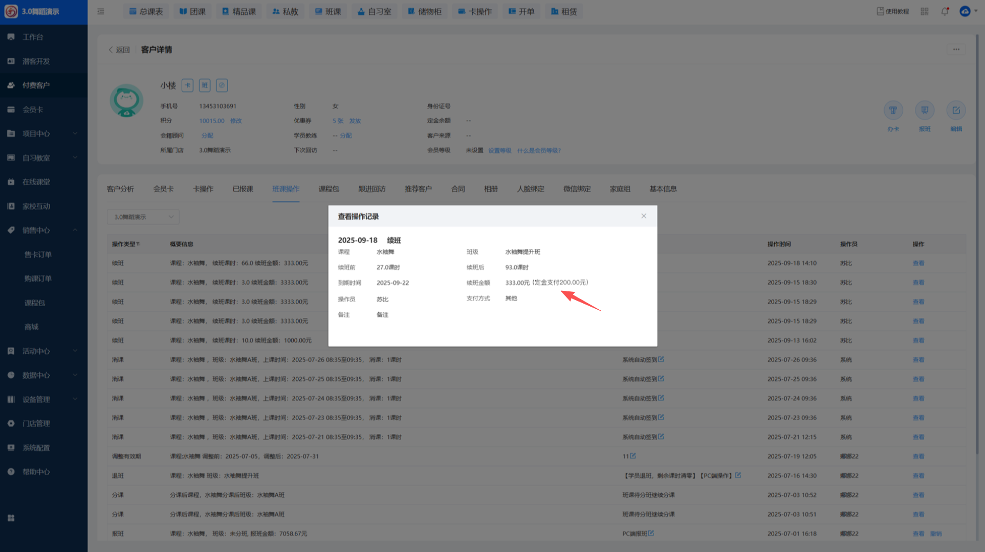 续班使用定金支付时,在班课操作-续班操作记录中显示“定金”扣除金额(显示在续班金额后)。