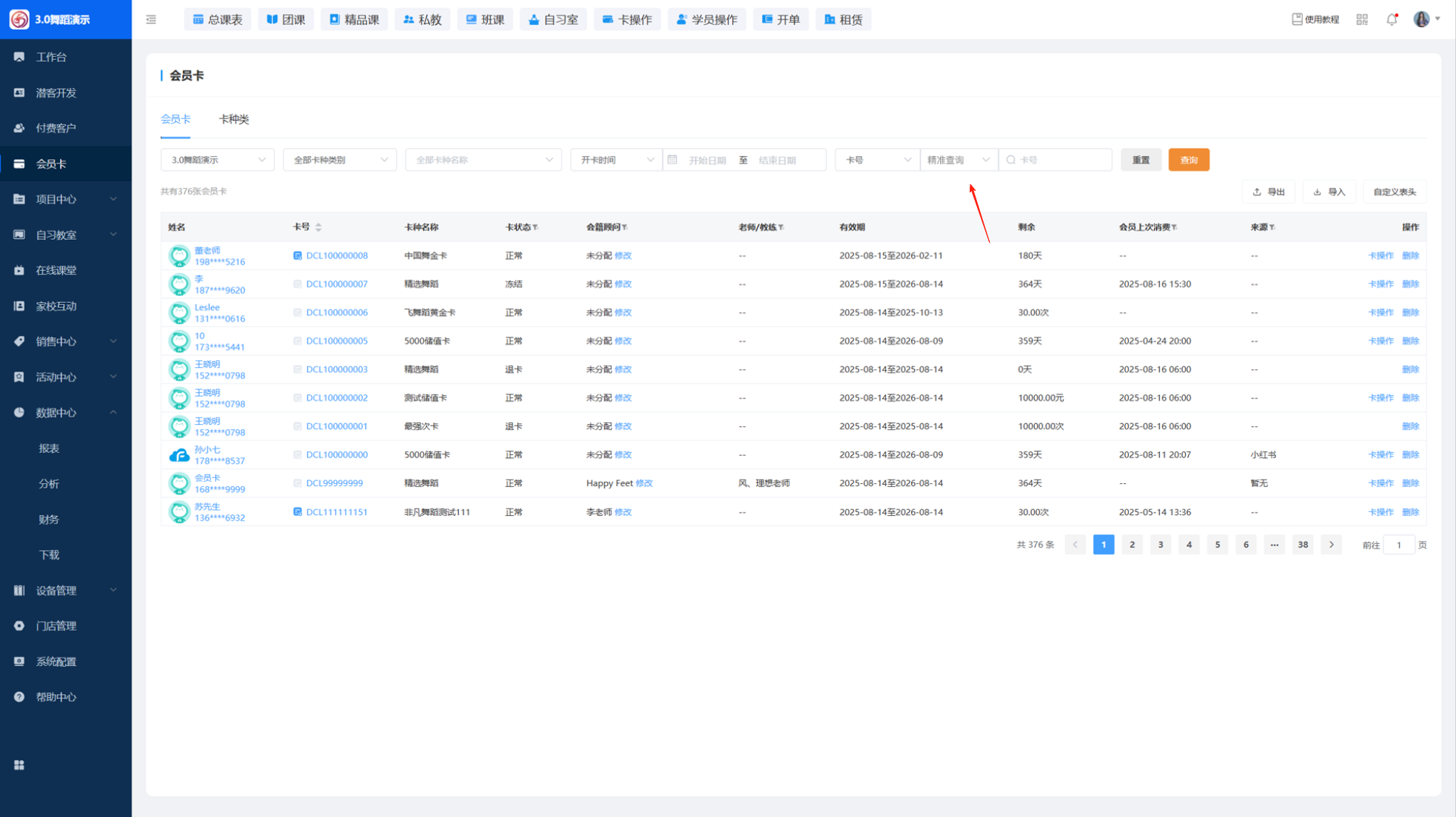 会员卡列表,“卡号查询”时可选择“模糊查询”,默认“精准查询”,至少输入2个字符,点击“查询”查询结果。