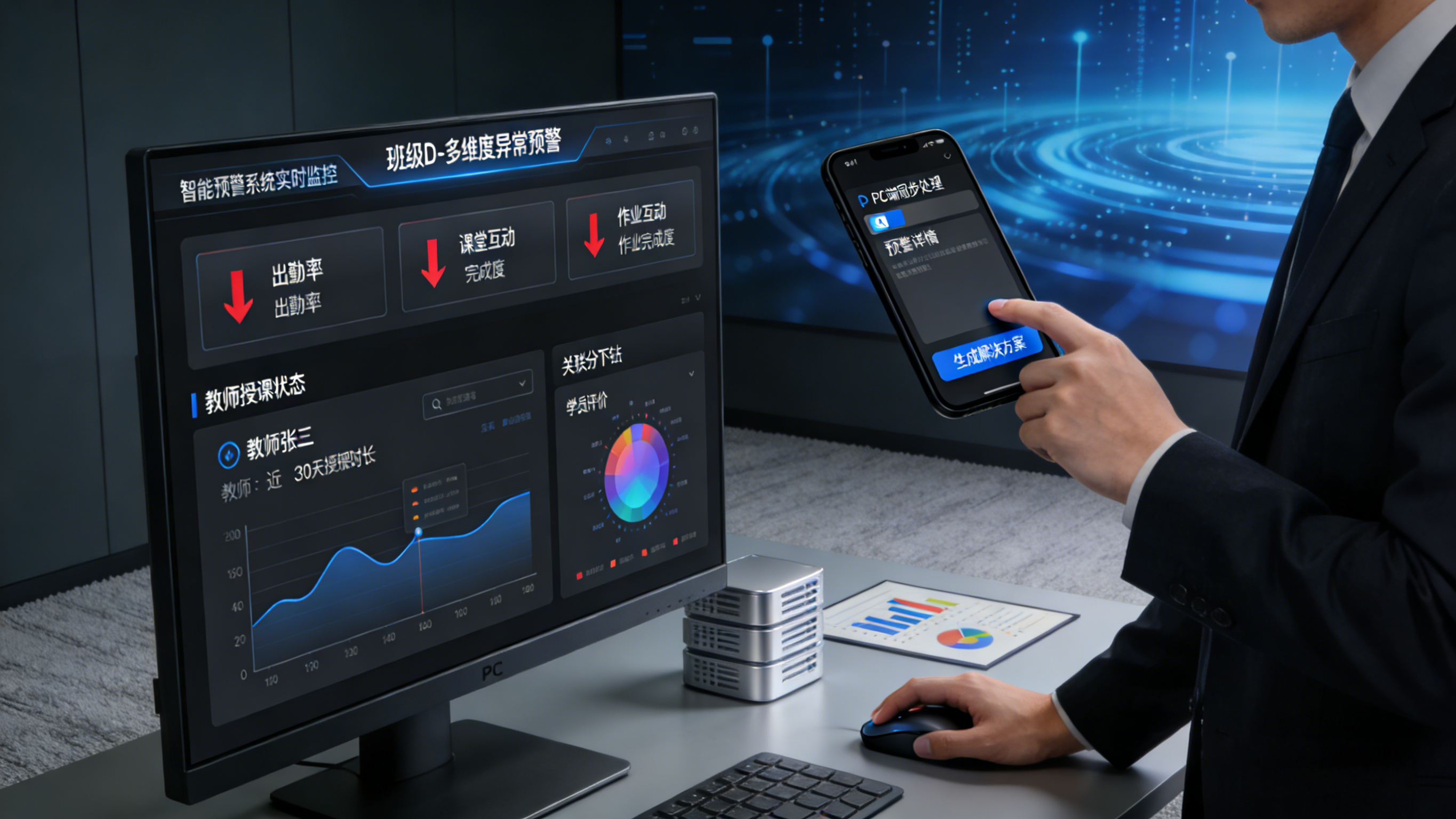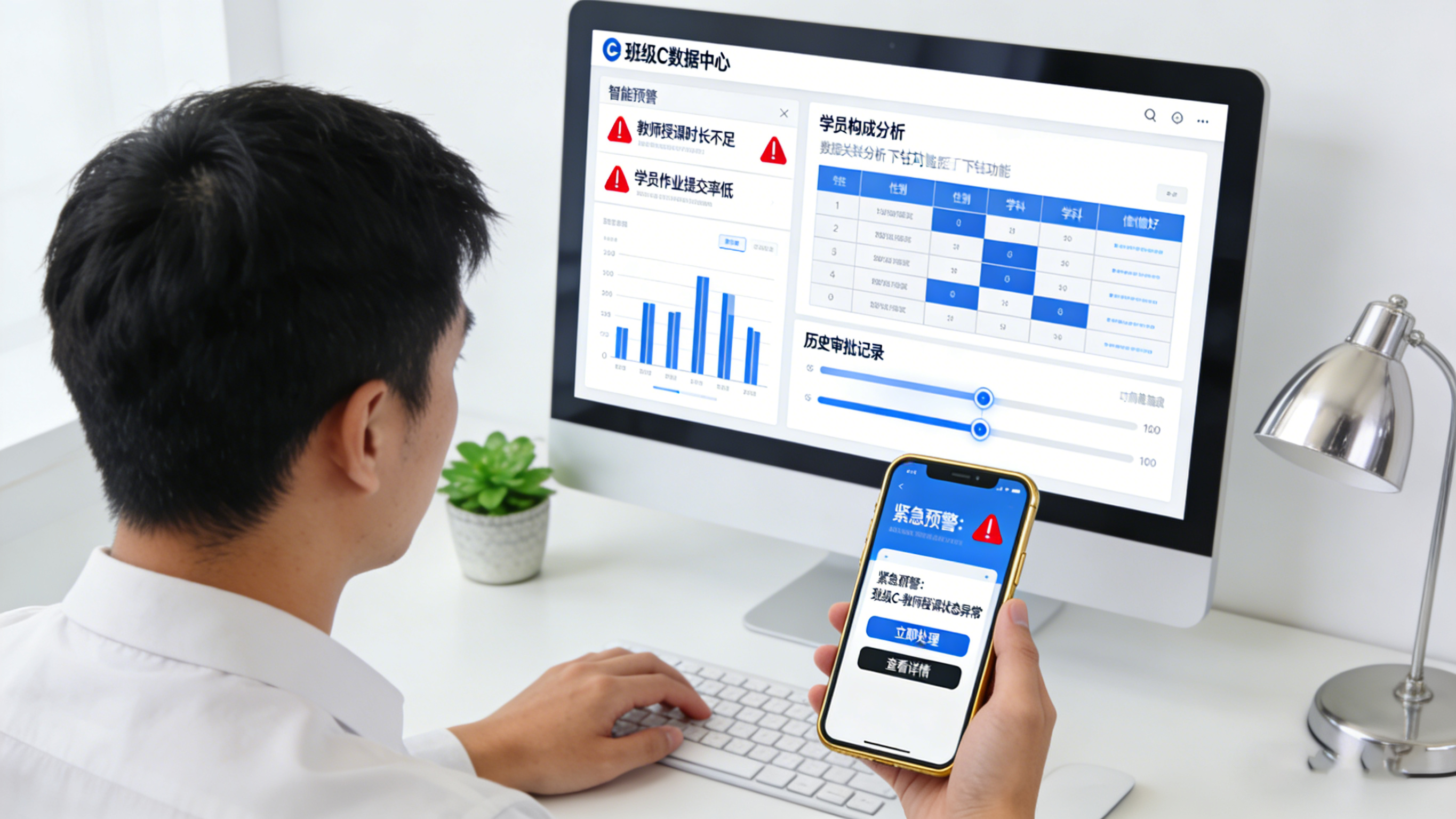 场景示例:教学主管在手机端收到“李老师班级本周审批内容”的预警推送,她立即在手机上查看初步情况。回到办公室后,她在PC端深入分析该班级历史审批数据、学员构成及李老师同期其他班级情况,结合系统内的沟通记录,精准判断是老师状态问题还是特定班级的学员问题,从而制定出有的放矢的解决方案。
